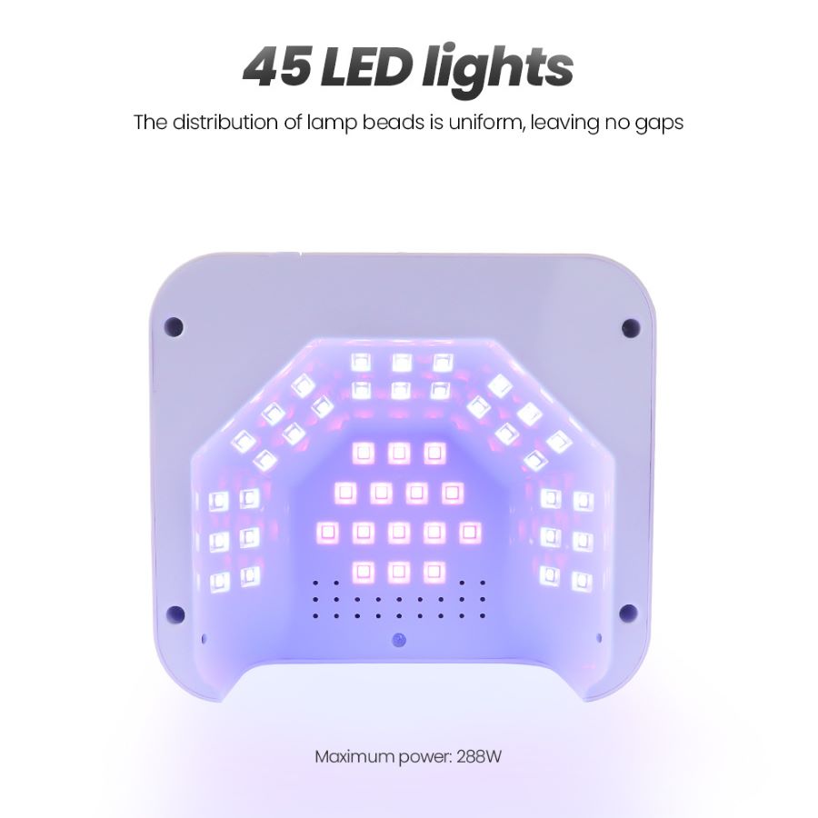 Dotée d'un design élégant et ergonomique, la lampe à ongles SUN 90 W offre une zone de polymérisation spacieuse pouvant accueillir les deux mains ou les pieds. Le capteur infrarouge intelligent active automatiquement la lampe lorsque vous glissez votre main dedans, et la minuterie intégrée vous permet de choisir parmi plusieurs temps de durcissement prédéfinis pour des résultats optimaux. L'écran LCD offre des commandes claires et intuitives, ce qui facilite la personnalisation de votre expérience de durcissement des ongles.